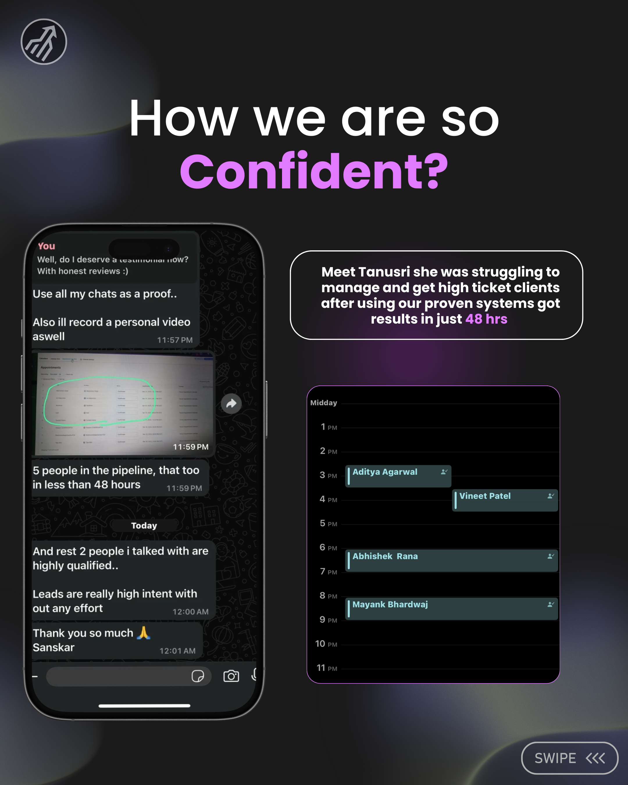 Sahil scaled his marketing agency from $7K/month to $50K/month in just 90 days after adopting our New Gen Agency System. He went from just 3 appointments per month to 80—booking up to 6 per day. On top of that, he built his coaching business from $0 to $12K MRR in just 30 days.